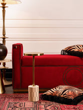 A compact cocktail table crafted from aluminium and wood resin, adorned with gold metal strips and finished in a natural lacquer. A luxurious accent piece for modern and contemporary interiors.