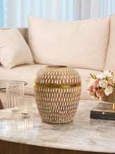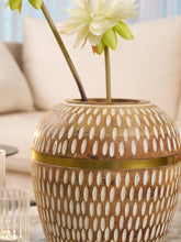 Handcrafted from mango wood in a refined whitewash finish and adorned with a lustrous gold band, this compact vase radiates charm. Perfect for small floral arrangements or as a luxe accent piece.
